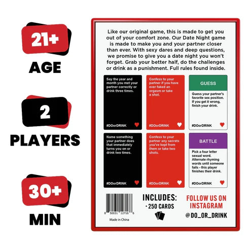 Do or Drink: Date Night er det perfekte kortspil til par, der gerne vil tilføje lidt krydderi til aftenen. Spillet kombinerer sjove, drilske og til tider udfordrende opgaver, som både kan føre til grin, overraskelser og nærvær. I skiftes til at trække et kort, der indeholder et frækt spørgsmål eller en våget udfordring. Vælg at gøre det – eller tag en slurk (eller en anden “straf” efter jeres eget valg)!